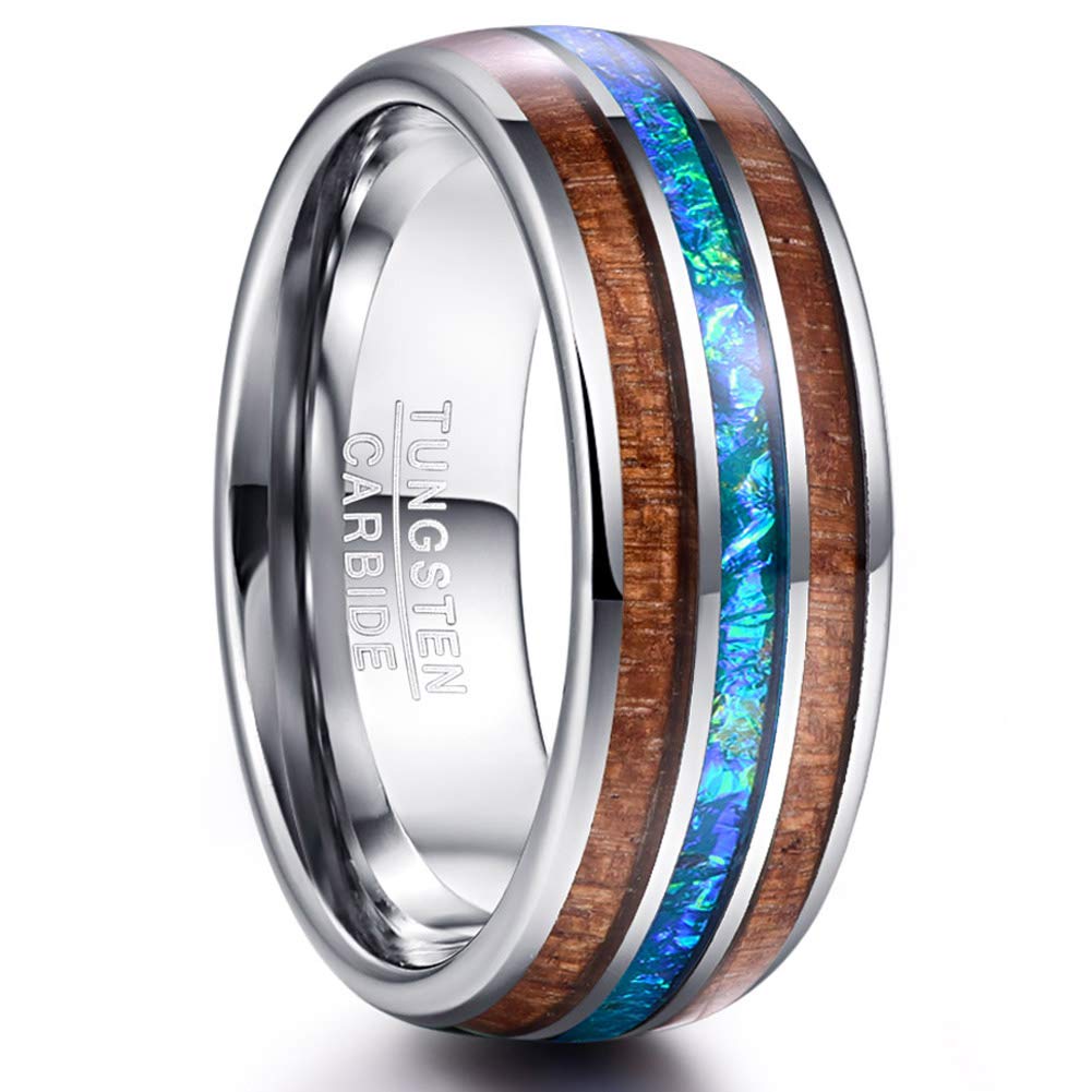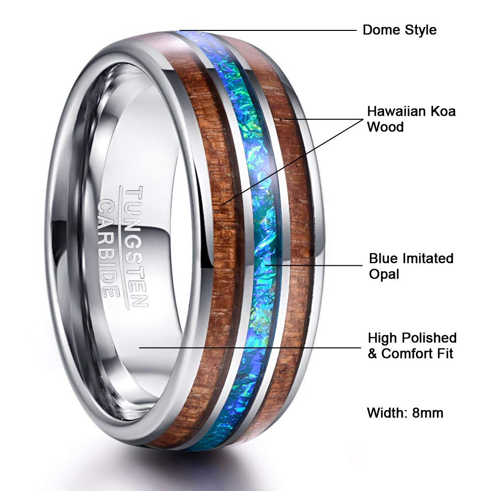 Imitated Opal Inlay: The center of the ring surface is inlaid with shiny imitated opal, making it a stunning look. Hawaiian Koa Wood Inlay: The two sides of imitated opal are inlaid with Hawaiian koa wood, bringing you close to nature.