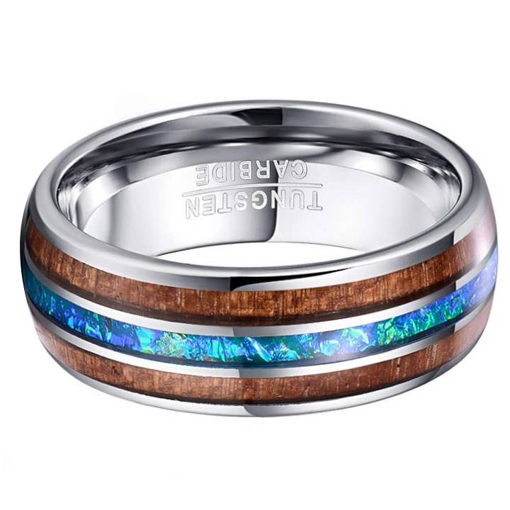 Hawaiian Koa Wood features rich and beautiful color and grain. Its color can vary from red to chocolate brown, and its grain ranges from plain to curly.The combination of Hawaiian koa wood and tungsten carbide creates a stylish and unique jewelry piece for wedding and engagement.
