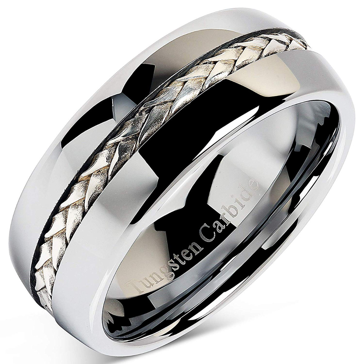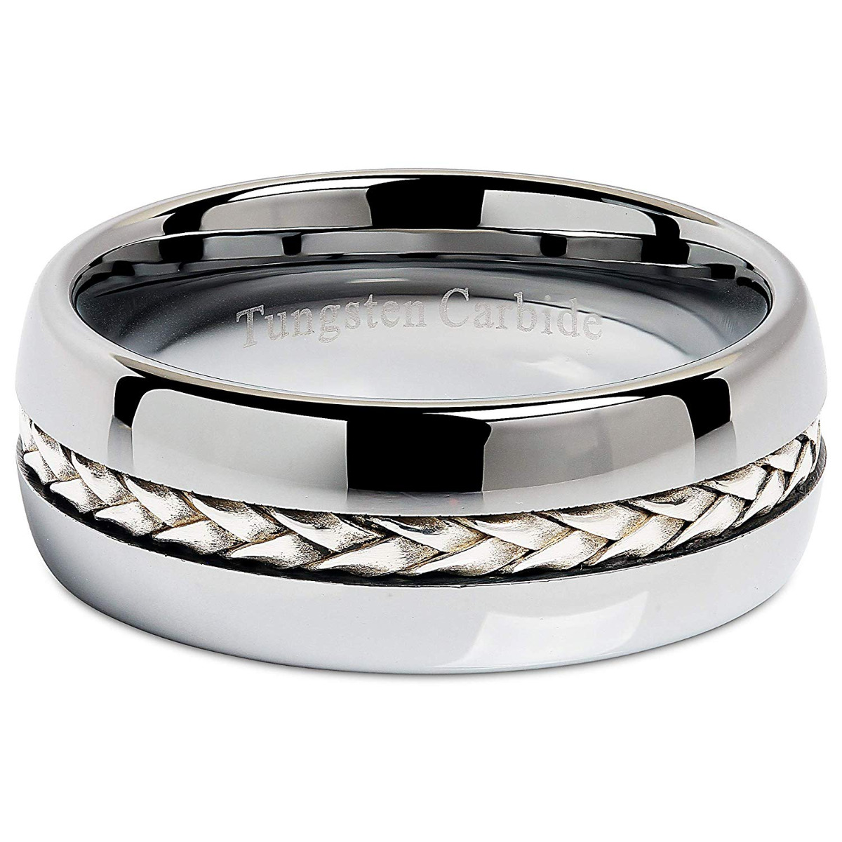 This is a popular tungsten carbide wedding band that features a silver rope inlay, giving it a unique and stylish look. The tungsten ring for men is available in widths of 4mm, 6mm, 8mm, and 10mm, making it suitable for both men and women. The comfort fit design ensures a comfortable wearing experience for extended periods of time. Tungsten carbide is a durable and scratch-resistant material that makes this silver tungsten rings suitable for everyday wear and is also an excellent choice for a wedding band.