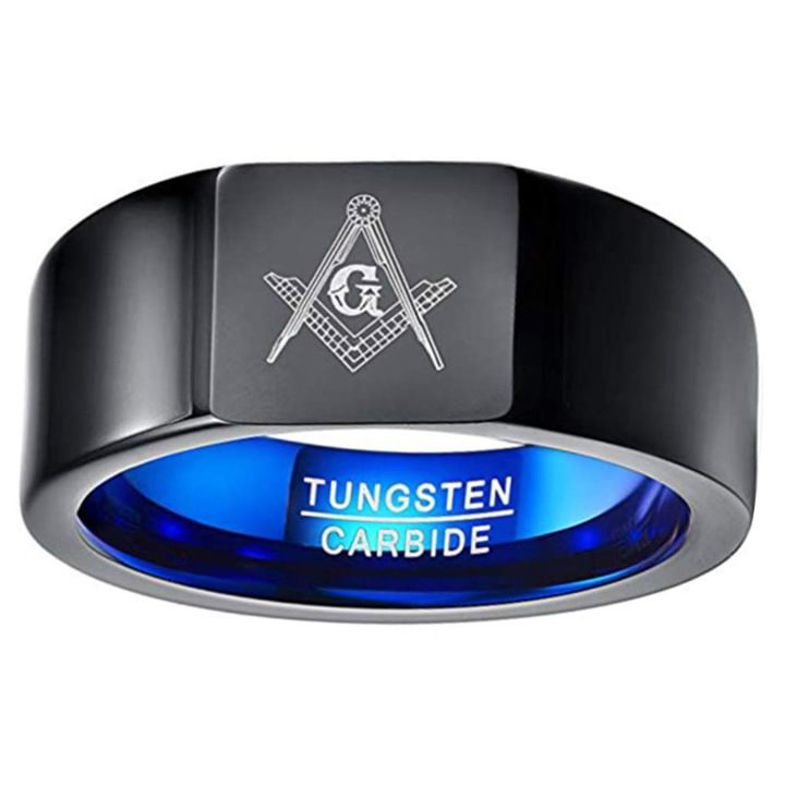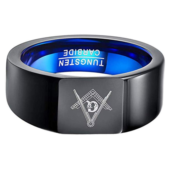 DESIGN: Black high polished finish surface with flat top and blue plated comfort fit inner surface.