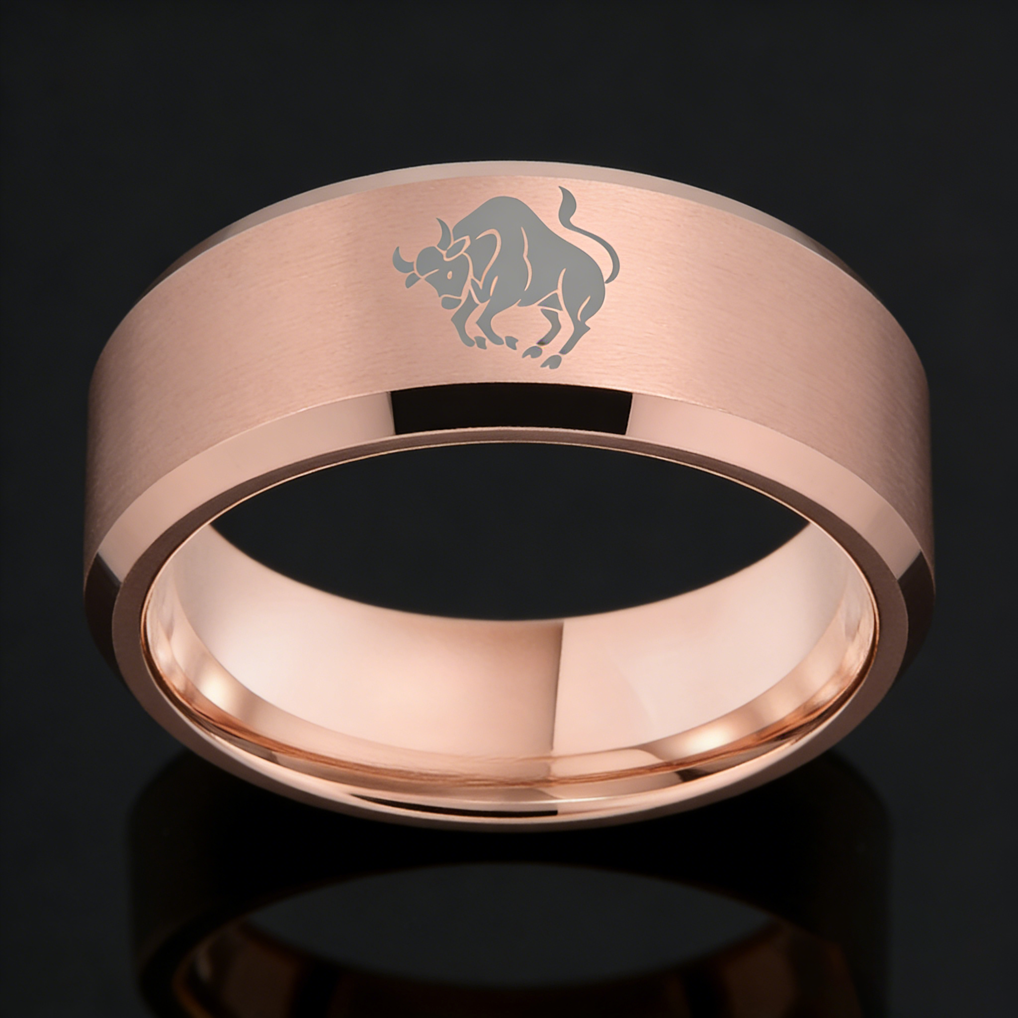 Mens Womens Rose Gold Taurus Tungsten Carbide Rings Rose Gold Edges and Laser Etched Wedding Bands Comfort Fit 4MM 6MM 8MM