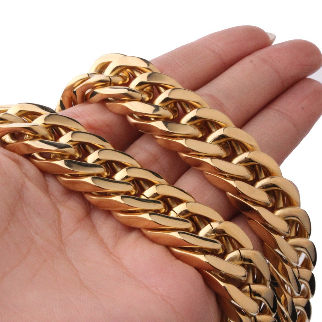 • The Necklace and Bracelet chains features a classic curb chain with shiny diamond-cut bevels. Exquisitely crafted and highly polished 316L stainless steel/18K gold plated Cuban chain brings out a bright shine, textured look, and smooth touch feeling. It's an essential daily wear piece for men and women.