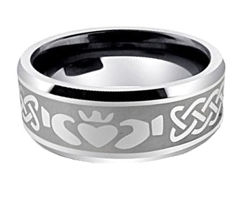 The Silver Celtic Knot Men's or Women's Irish Claddagh Tungsten Carbide Wedding Band Rings with Laser Etched Heart in Hands is a beautiful and symbolic option for couples looking for a unique wedding band. The silver Celtic knot design is a timeless symbol of unity and continuity, while the laser-etched Claddagh design adds a touch of tradition and symbolism to the silver wedding bands.