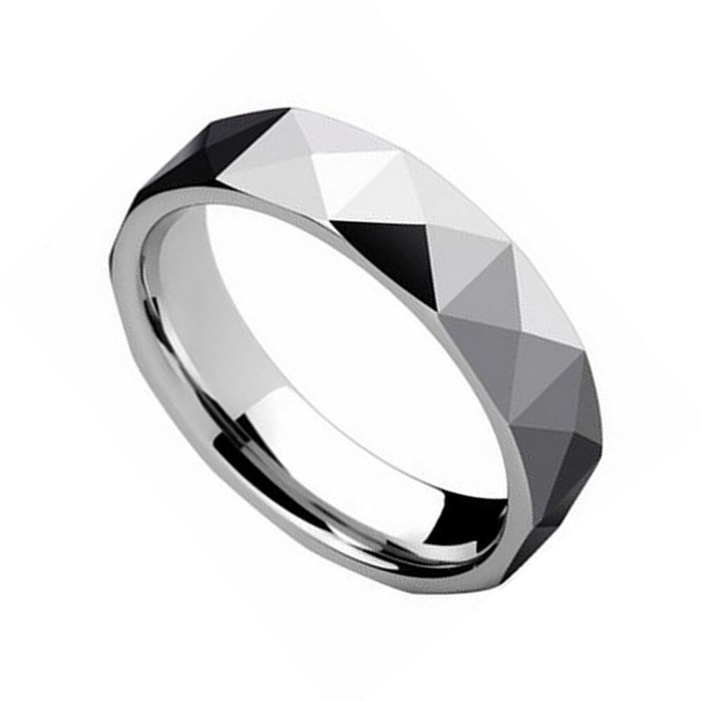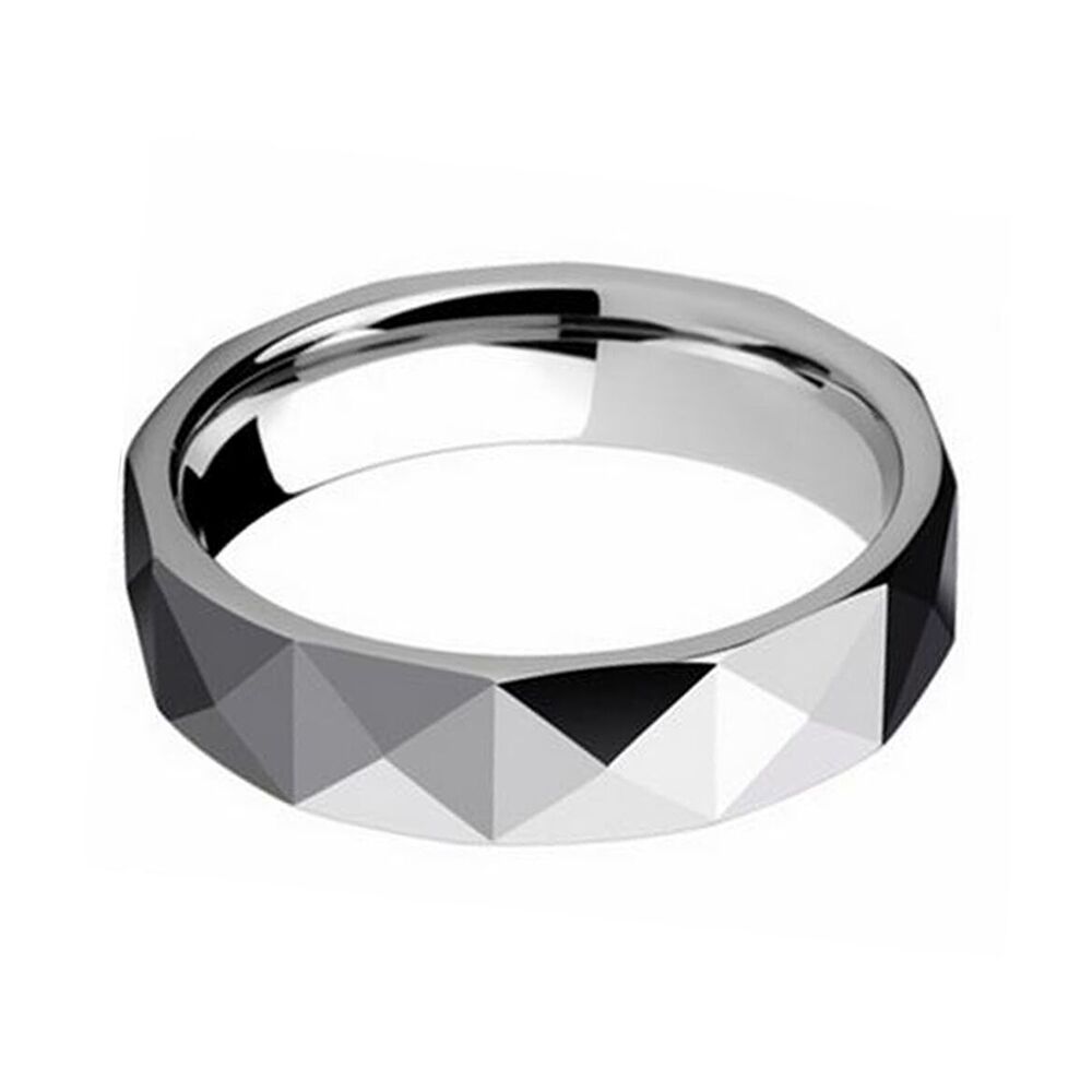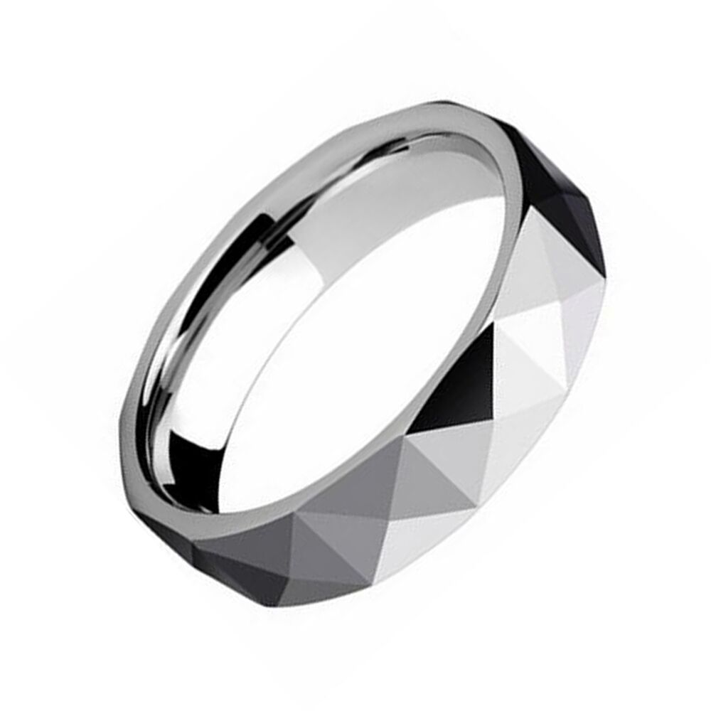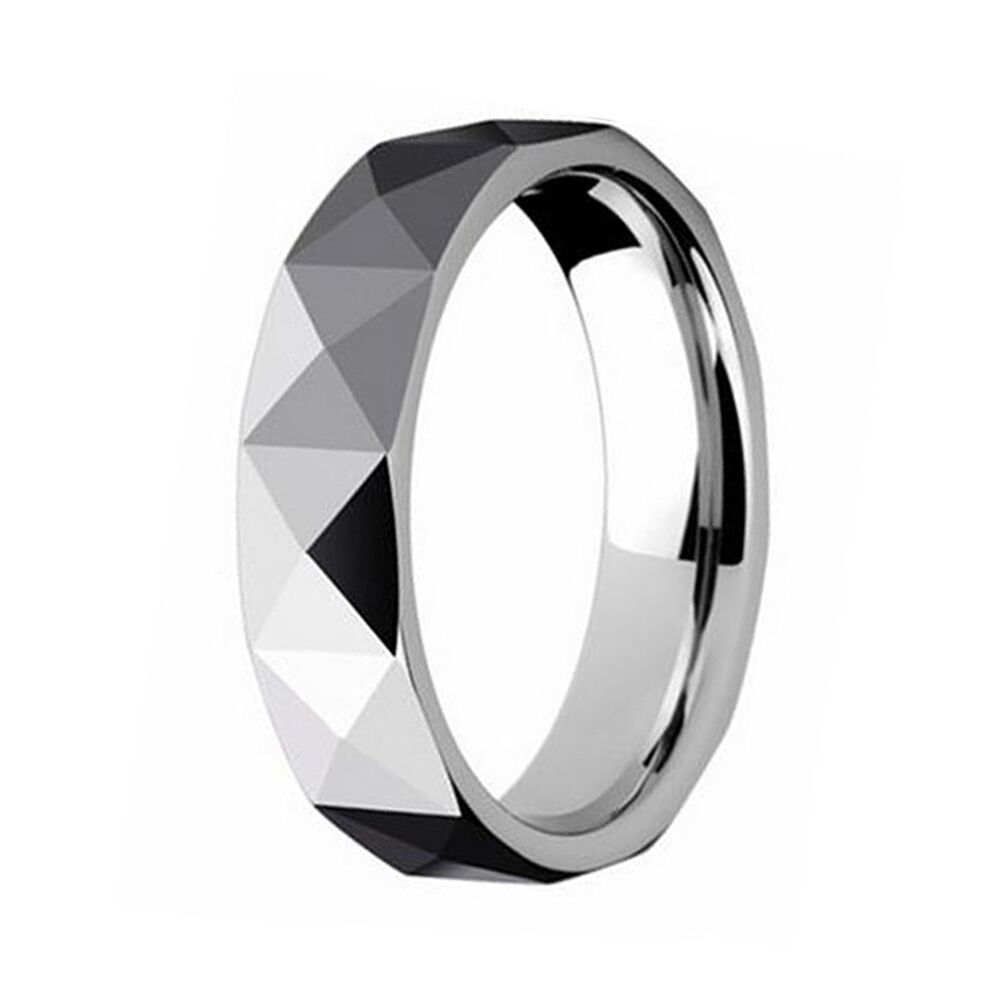 Tungsten carbide rings are known for their durability and scratch resistance, making them a popular choice for wedding bands. The multi-faceted design adds a unique and modern touch to the ring, and the polished finish gives it a sleek and sophisticated look.The 5mm width is a popular choice for those who want a more understated look, but it's important to consider personal style and comfort when choosing a ring width. This ring can be a great option for couples looking for a durable and stylish wedding band.