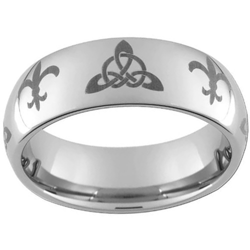 A silver tungsten carbide wedding band with a domed multi Triquetra Celtic knot design and laser-etched Irish Trinity and Fleur De Lis symbols can be a beautiful and meaningful choice for both men and women.