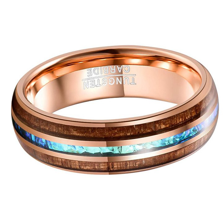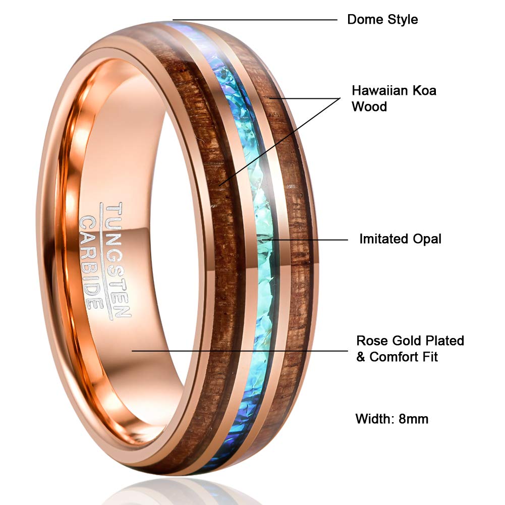 Imitated Opal Inlay: The center of the ring surface is inlaid with shiny imitated opal, making it a stunning look. Hawaiian Koa Wood Inlay: The two sides of imitated opal are inlaid with Hawaiian koa wood, bringing you close to nature.