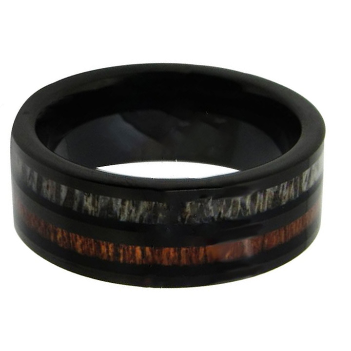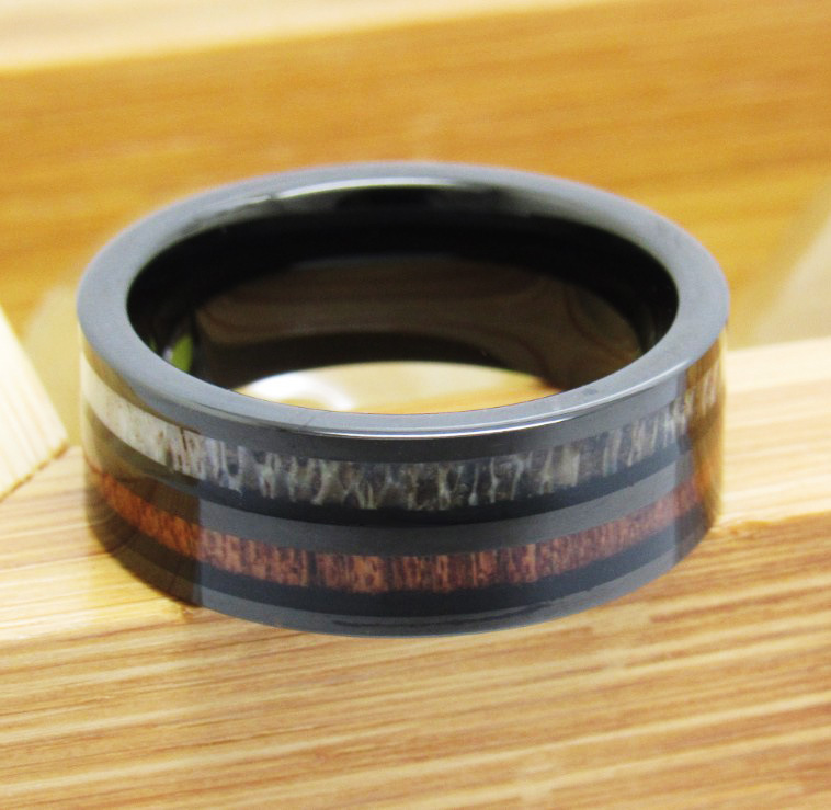 This beautiful black pipe cut tungsten carbide ring with dark koa wood and deer antler inlay designs. It is 6mm 8MM in width. If you are looking for a ring that is scratch proof and forever keep its shine, than our Tungsten Carbide rings are for you. Tungsten Carbide is ranked second hardest next to diamond on the Mohs scale, diamond being a 10 followed by Tungsten Carbide as 9.