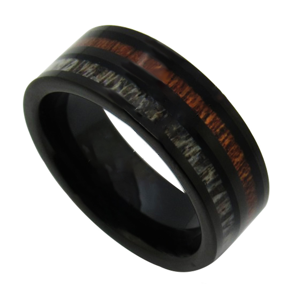 Mens Tungsten Wedding Bands Black with Antler and Wood Inlay Design.