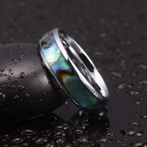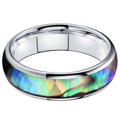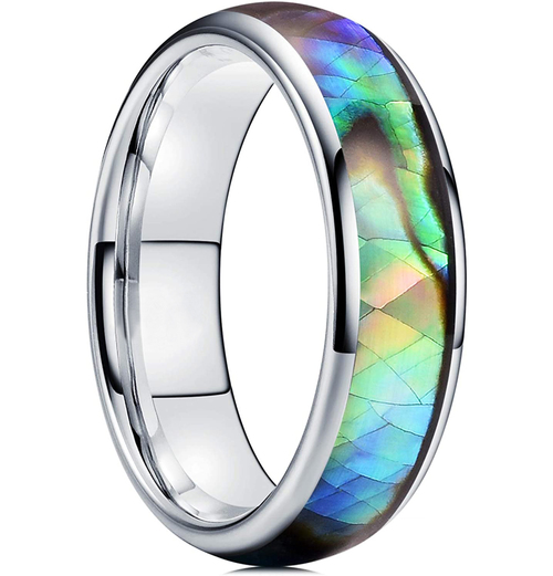 6MM 8MM Tungsten Matching Domed Silver Band and Multi Color Rainbow Abalone Shell Inlay Carbide Wedding Band Ring for womens or mens.