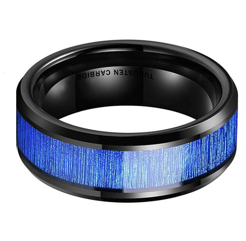Women's Tungsten Wedding Bands Wood Inlay and Black and Blue Tone.