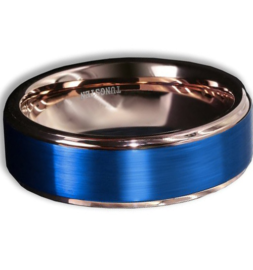 Tungsten Carbide Ring 8mm with 18K Rose Gold Tone with Blue Matte Finish Top. High Quality Polished Tungsten wedding band, Tungsten wedding ring or Anniversary Ring for men or women.