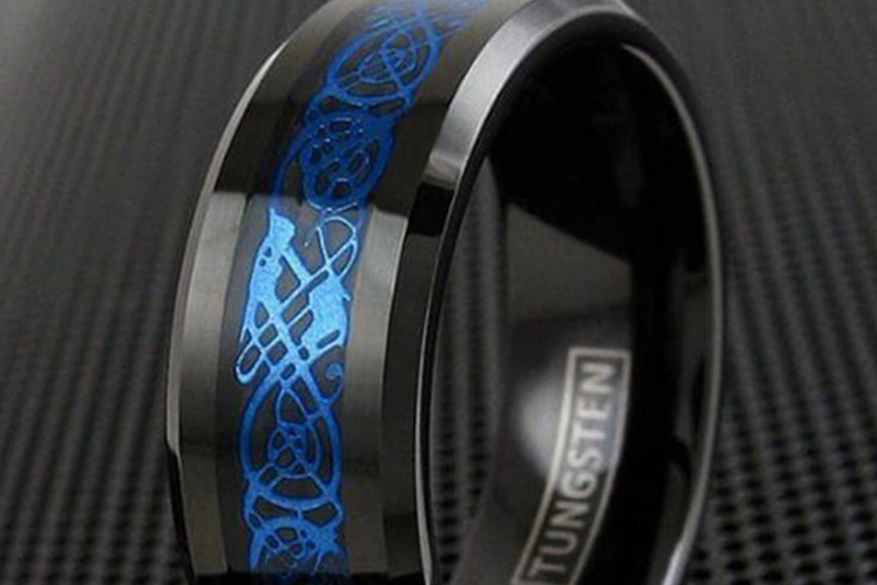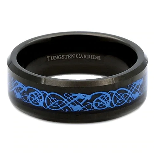 The Women or Men's Tungsten Carbide Wedding Rings Band with a Black Resin Inlay and Sky Blue Celtic Dragon Knot Ring design is a unique and stylish option for those who want a wedding band that stands out. The black resin inlay and sky blue Celtic dragon knot design create a bold and eye-catching look that is sure to make a statement. The black resin inlay and sky blue Celtic dragon knot design add a pop of color and personality to the tungsten ring for men, while still maintaining a timeless and classic look. The design is available in a range of widths, from 4mm to 10mm, making it suitable for both men and women. Overall, the Women or Men's Tungsten Carbide Wedding Rings Band with a Black Resin Inlay and Sky Blue Celtic Dragon Knot Ring design is a great choice for those who want a wedding band that is both unique and timeless. The black resin inlay and sky blue Celtic dragon knot design create a bold and colorful look that is sure to make a statement, while the durable and scratch-resistant tungsten carbide ensures that the ring will last for many years to come.