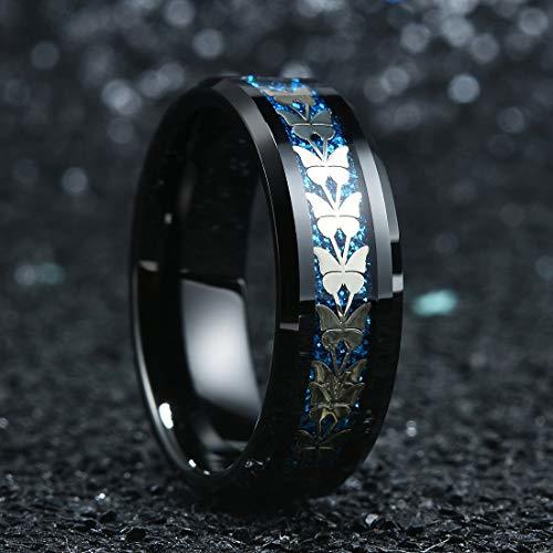Women's Or Men's Butterfly Tungsten Carbide Wedding Band Matching Rings,Black Tungsten Carbide Ring with Butterflies over Blue Sandy Inlay With Mens And Womens For Width 8MM