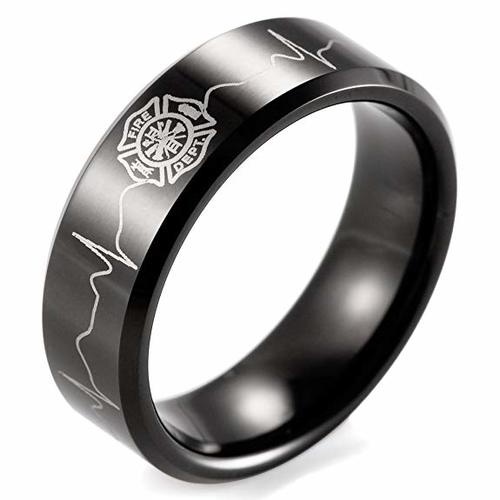Women's or Men's EMS Firefighter / Fireman / Fire Dept,EKG Pattern Tungsten Carbide Wedding Band Rings,Black with Laser Etched Logo With Mens And Womens For Width 4MM 6MM 8MM 10MM