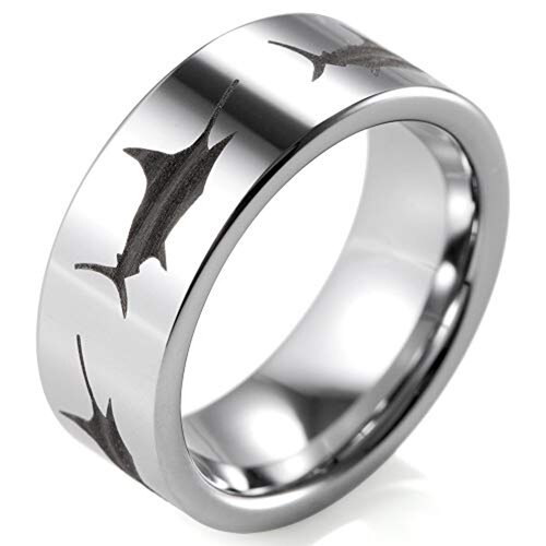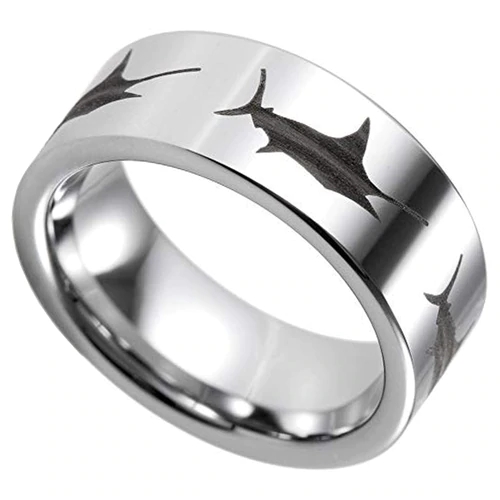 Women's Or Men's Fisherman's Ring / Fishing Wedding Band Rings,Silver Tungsten Carbide Band with Etched Sword Fish Design Ring With Mens And Womens For Width 4MM 6MM 8MM 10MM