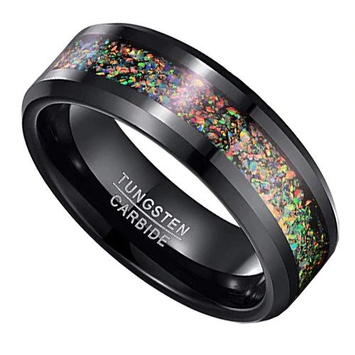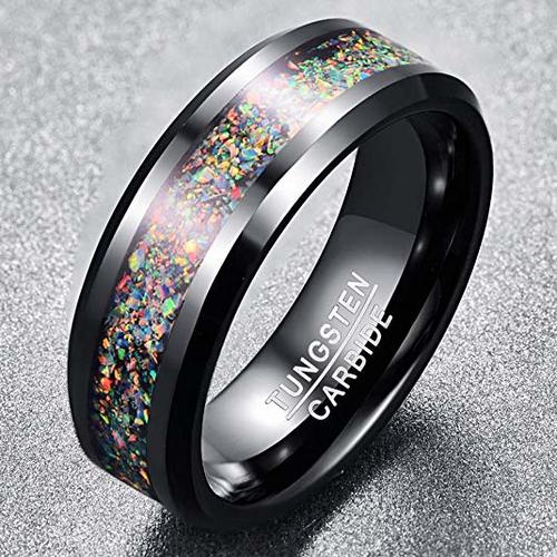 Women's Or Men's Tungsten Carbide Wedding Band Matching Rings,Black Bands and Multiple Color Rainbow Opal Inlay with Organic Tones Ring With Mens And Womens For Width 4MM 6MM 8MM 10MM