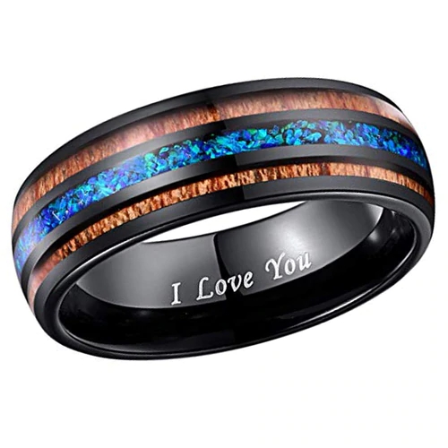 Women's Or Men's Tungsten Carbide Wedding Band Matching Rings,Black Tone Wood and Sea Blue Opal Inlay Ring I Love You Text With Mens And Womens Ring For Width 4MM 6MM 8MM 10MM