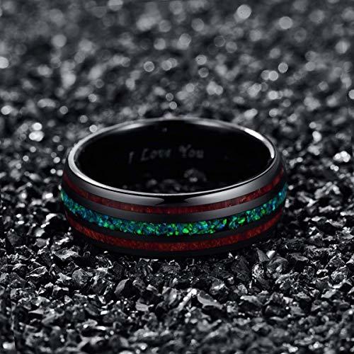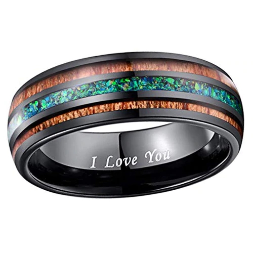 Women's Or Men's Tungsten Carbide Wedding Band Matching Rings,Black Tone Wood and Sea Green Opal Inlay Ring,I Love You Text With Mens And Womens Ring For Width 4MM 6MM 8MM 10MM