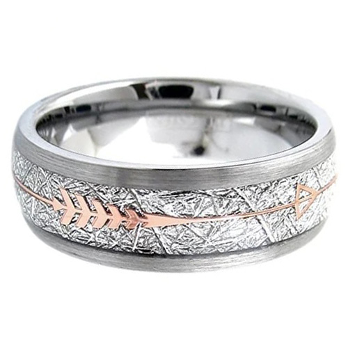 These tungsten carbide wedding bands with a rose gold-tone finish, Cupid's arrow design, and inspired meteorite inlay can make a great gift for couples who value elegance and sophistication. The design of these rings makes them a versatile choice that can be worn with a variety of styles, making them perfect for any occasion.