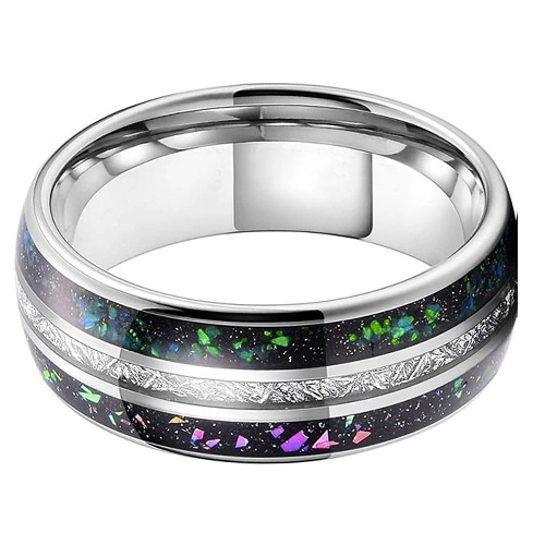 Women's Or Men's Tungsten Carbide Wedding Band Matching Rings,Silver Tone Meteorite Ring with Multi Color Rainbow Opal Inlay Organic Colors Rings With Mens And Womens For Width 4MM 6MM 8MM 10MM