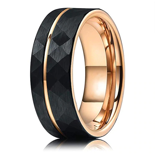 Women's or Men's Tungsten Carbide Wedding Band Rings,Hammered Brushed Black Tungsten Carbide Ring With Rose Gold Interior And Stripe Design With Mens And Womens For Width 4MM 6MM 8MM 10MM