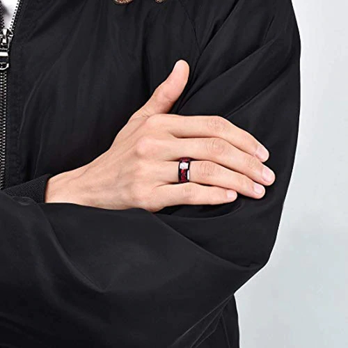The dark color watch gear resin inlay design adds a mechanical and industrial look to the design, while the red carbon fiber adds a pop of color and visual interest. These red wedding bands are also hypoallergenic, making them a great choice for those with sensitive skin.