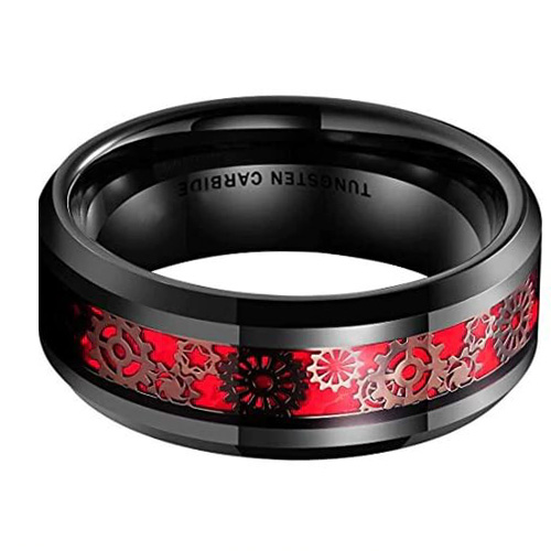 Women's or Men's Tungsten Carbide Wedding Band Watches Gear Rings,Black With Dark Color Watch Gear Resin Inlay Design Over Red Carbon Fiber Tungsten Ring With Mens And Womens RingsFor 4MM 6MM 8MM 10MM
