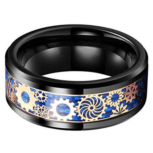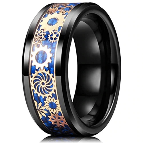 The women's or men's tungsten carbide wedding band watches gear rings with black and gold watch gear resin inlay design over blue carbon fiber tungsten ring are a unique and stylish option for wedding bands. The design features a combination of black and gold watch gear resin inlays over a blue carbon fiber tungsten ring, creating a modern and edgy look.