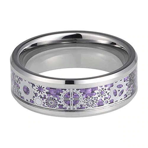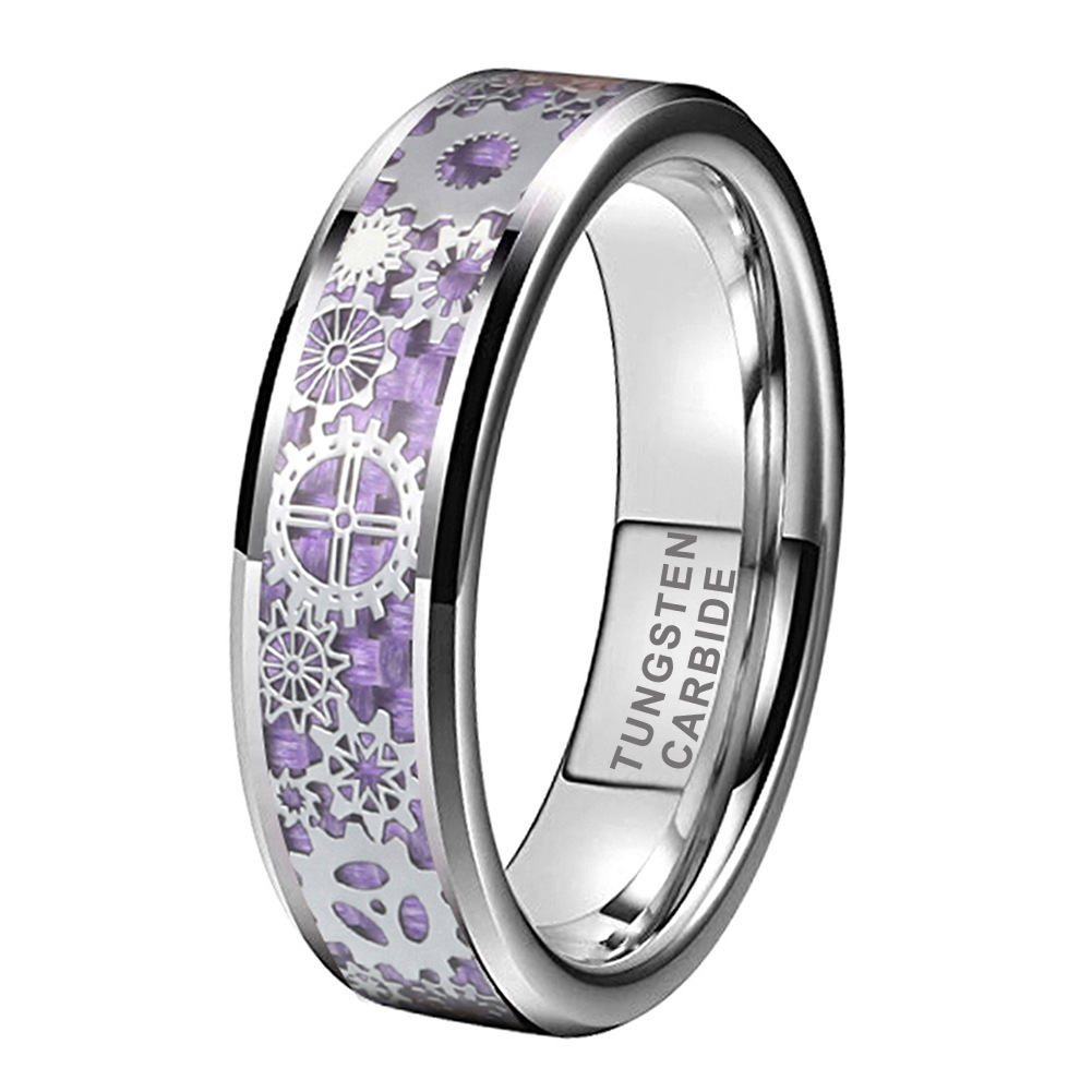 Women's or Men's Tungsten Carbide Wedding Band Watches Gear Rings,Wedding ring band Violet Purple Carbon Fiber Inlay Silver Band with Silver Mechanical Gears,Tungsten Carbide Ring With Mens And Womens Rings For 4MM 6MM 8MM 10MM