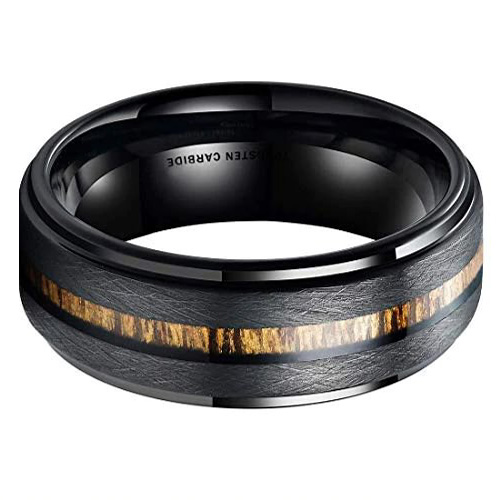 It sounds like you are describing a particular style of Tungsten Carbide Rings that features a black finish, a centered koa wood slice inlay, and a flat edge design. This type of ring is known for its durability and scratch resistance, as well as its unique and stylish appearance.
