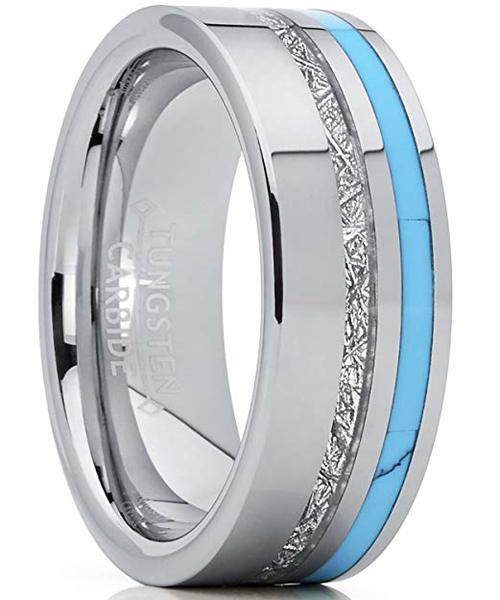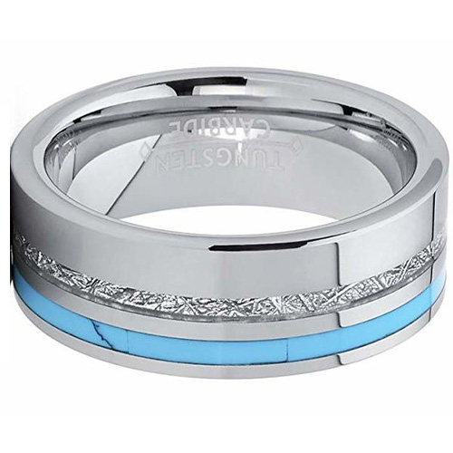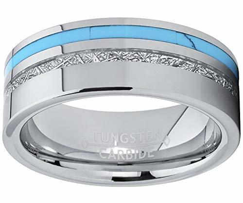 Women's Or Men's Wedding Tungsten Carbide Wedding Band Matching Rings,Silver Tungsten Carbide Bands with Blue Turquoise and Inspired Meteorite Inlay,Pipe Cut Tungsten Carbide Ring With Mens And Womens For Width 6MM 8MM