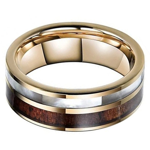 Women's Or Men's Wedding Tungsten Carbide Wedding Band Matching Rings,Yellow Gold Band with White Shell and Wood Inlay. Comfort Fit Tungsten Carbide Pipe Cut Ring With Mens And Womens For Width 4MM 6MM 8MM 10MM